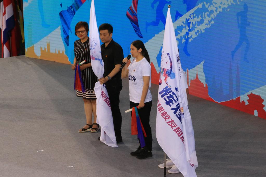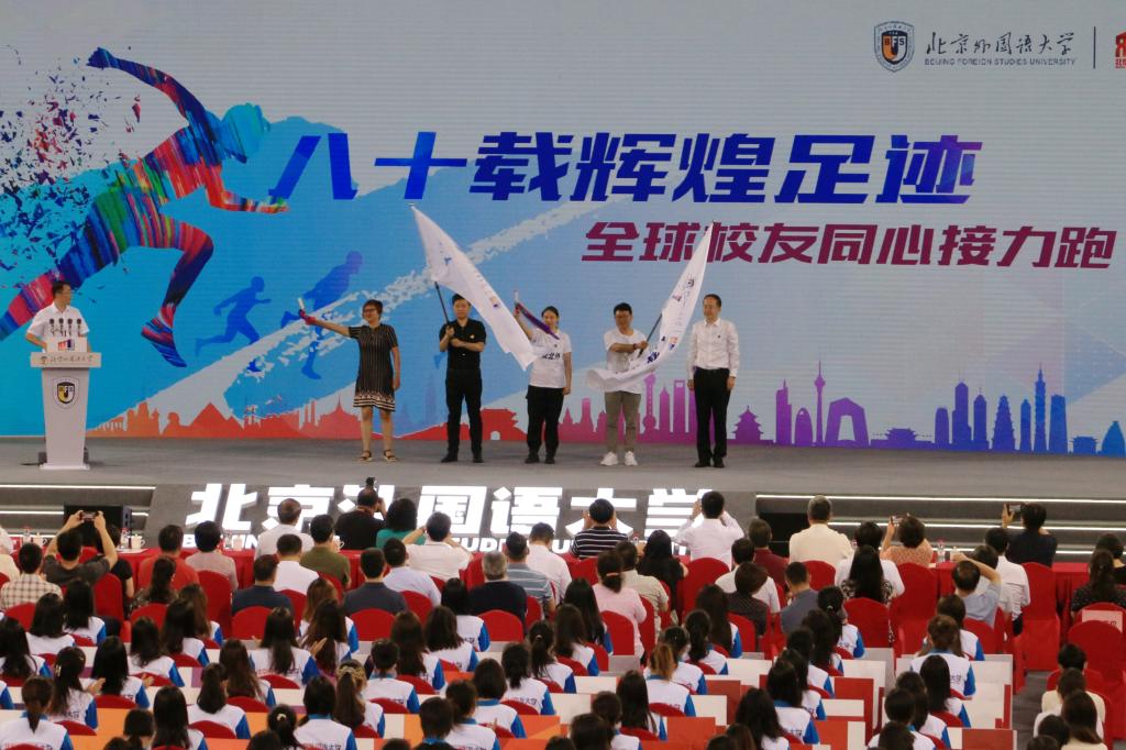 捐赠仪式后,党委副书记、副校长贾文键及众多知名校友共同启动“八十载辉煌足迹,全球校友同心接力跑”活动。beat365官网卓悦同学作为留学生代表参与传递接力棒、接力旗环节。