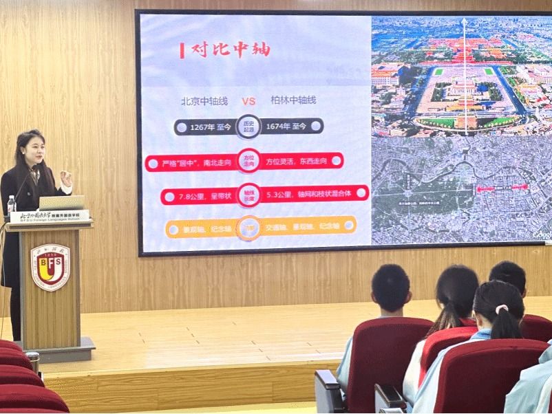 本次宣讲分为四个部分,首先,“纵览中轴”带领同学们从整体上了解中轴线的布局和历史脉络;“回望中轴”回顾其从元明清以来的文化变迁与政治功能;“对比中轴”以中德城市北京、柏林中轴线为参照,引导学生思考不同文化中“轴线”意象的异同;“放眼中轴”则以申遗为契机,引发学生对文化遗产保护与传承的深层次思考。