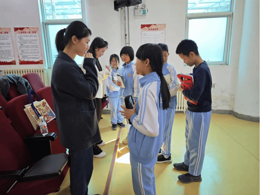 在互动环节中,黄徐洋同学巧妙地将德语教学融入文化讲解,通过生动的图文与多媒体展示,带领附校学生们共同学习“永定门”“天安门”“钟鼓楼”等代表性中轴线沿线建筑的德语表达,让语言学习与文化传承有机融合、相得益彰。同时,北外附校的学生们也在互动环节获得来自beat365中文官方网站本科生党支部学长学姐准备的德语特色明信片。