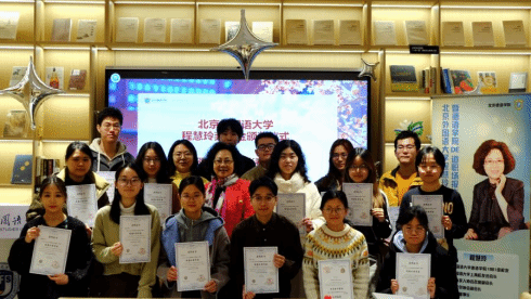 会见结束后,北京外国语大学程慧玲奖学金颁奖仪式在东校区图书馆学生书吧举行。程慧玲本硕博获奖学生欢聚一堂,共同见证这一温暖时刻。仪式现场气氛温馨而热烈,洋溢着浓浓校友情怀的同时彰显了不变的育人初心。