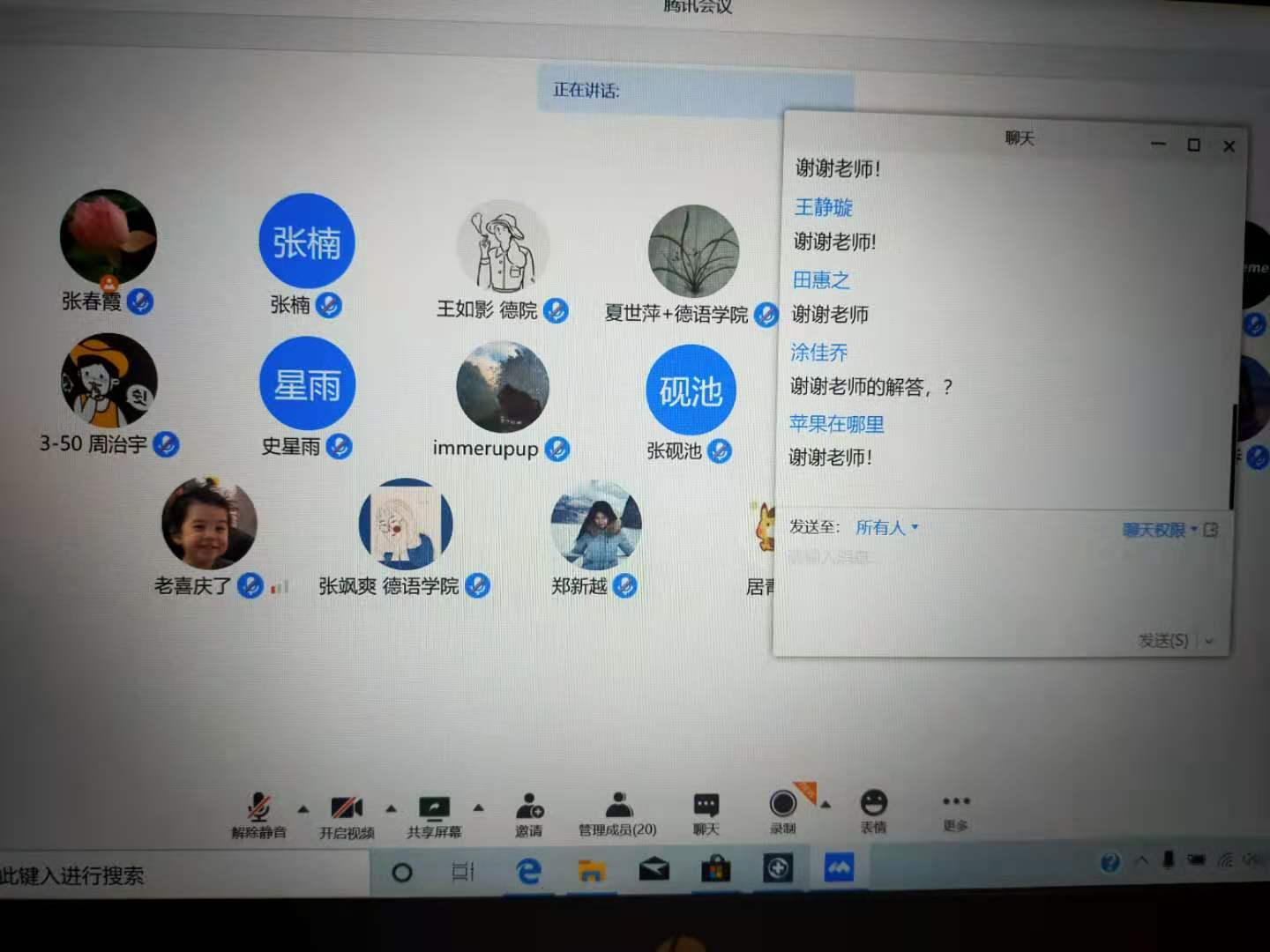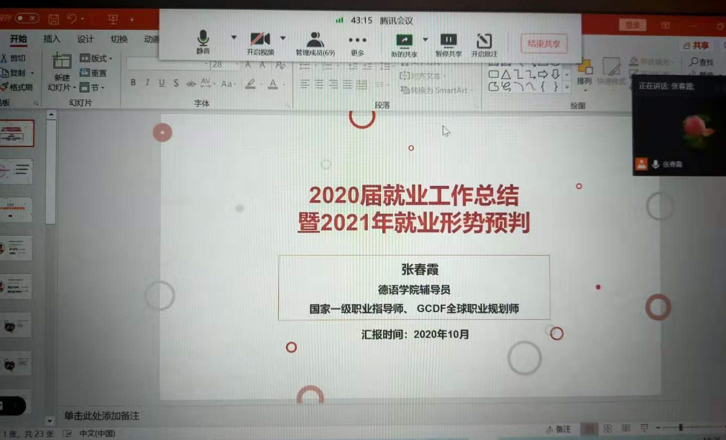 10月16日17:00—19:00,beat365中文官方网站召开“2020年就业总结及2021年就业形势研判”线上会议。70余名研究生参加了会议。辅导员张春霞总结了beat365中文官方网站近五年来研究生就业情况,分析了研究生的就业类型、就业行业、就业数据等,结合2021年高校毕业生人数、全国德语专业毕业生人数、目前秋招情况等对2021年的德语专业就业形势进行了分析和预判,对2021年的研究生就业进行了布置。