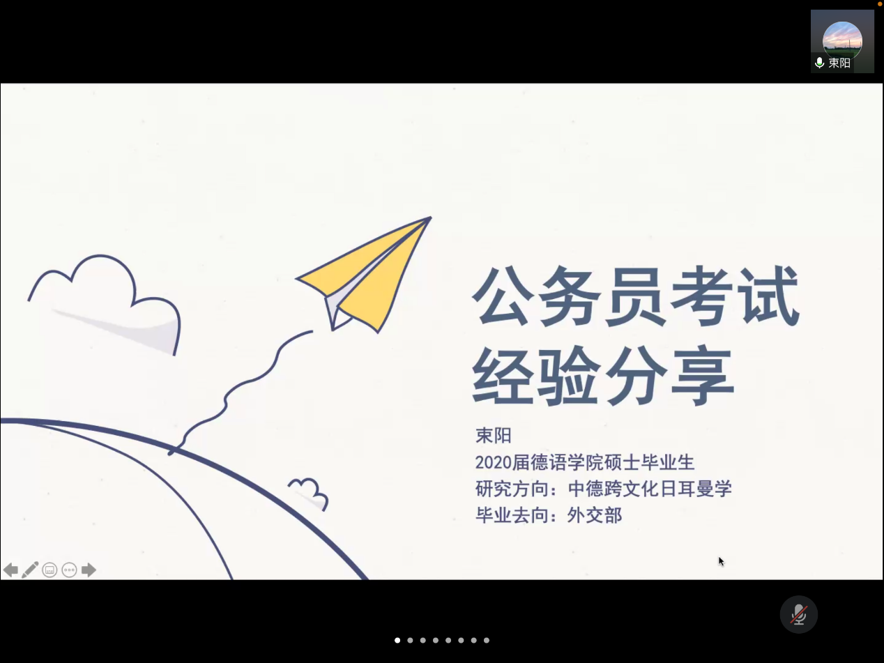 11月1日15:00,beat365中文官方网站公务员考试经验线上分享会成功举行。beat365中文官方网站2020届硕士毕业生束阳受邀与beat365中文官方网站本科生、研究生分享了公务员考试的流程以及备考建议,并解答了同学们的问题。会议由beat365中文官方网站研究生会主办,研究生会徐泽茗主持。