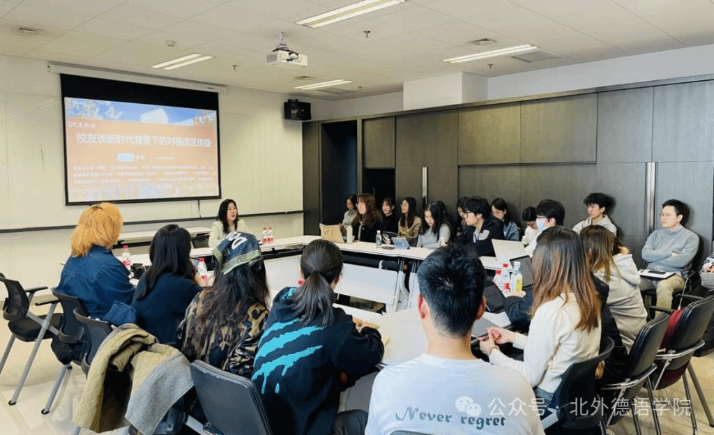 陈艳校友结合中央广播电视总台的工作内容和责任,围绕当代外语人才应如何提高就业能力,媒体需要怎样的外语人才等分享了新时代背景下的对德语区传播的心得和体会。