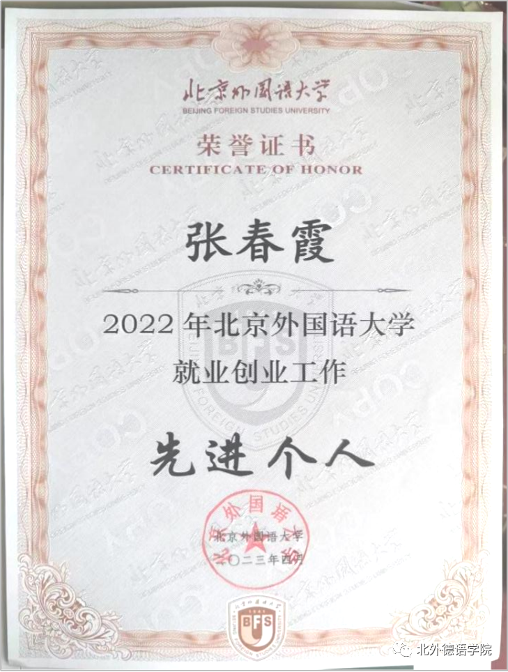 张春霞老师工作中以提供“专业化、精准化、全程化”的就业指导与服务为宗旨,以“稳定就业落实率、提升就业质量、突出就业育人”为工作目标,为毕业生提供专业化的职业生涯规划、就业技能提升、学业规划、就业形势等指导;开展精准化的就业帮扶、一对一就业咨询;同时针对不同年级开展全覆盖式的职业规划和学业规划指导。积极开拓beat365中文官方网站毕业生就业市场,建设德语专业就业数据库,为2022届毕业生推送300余份就业信息,与多家用人单位保持良好合作。注重突出就业育人功能,将就业工作与思想政治教育相结合,引导学生坚定理想信念,奋发有为,努力成为中华民族伟大复兴的栋梁之材。