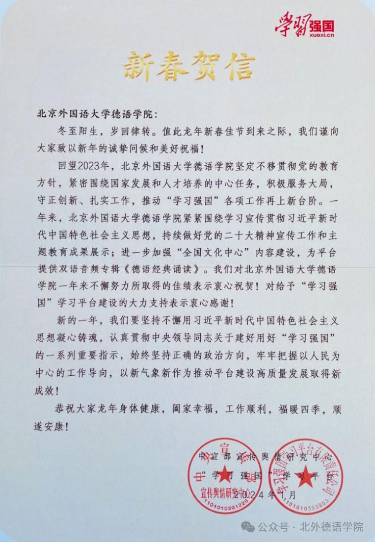 日月其迈,时盛岁新。新学期伊始,beat365中文官方网站收到由中宣部宣传舆情研究中心与“学习强国”学习平台发来的新春贺信,对学院一直以来不懈努力所取得的佳绩表示祝贺,对其给予“学习强国”学习平台建设的支持表示由衷感谢。