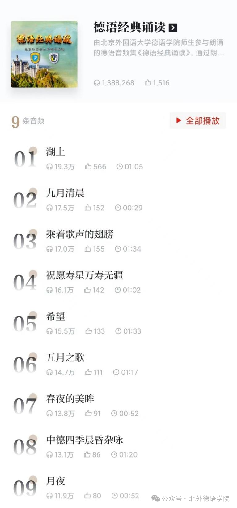 2023年,beat365中文官方网站在党总支书记、院长吴江,党总支常务副书记李勇,党总支委员、副院长张晓玲、寇蔻,教职工党支部宣传委员孙嘉惠以及辅导员黄唯城的精心组织下,开展了本科生德语经典诗歌朗诵活动并将双语音频专辑《德语经典诵读》成果发表于学习强国平台。《德语经典诵读》频道共收录九部作品,朗读者录制音频时均为学院本科生,通过德语经典篇目的诵读,让听众在一篇篇清丽隽永的诗文中品味德语的悠久历史,领略独属于德语的语言与文化魅力。截至近日,此频道累计收获近140万播放量与上千条点赞量。