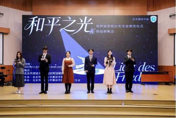 和平的薪火长明,点亮了逐梦的征程与希望。2025年11月2日晚,第四届荣裕民奖学金颁奖仪式暨“和平之光”迎新晚会于阿语楼国会厅隆重举行。本次晚会由北外beat365中文官方网站主办,团总支学生会承办,在这秋意正浓的美好时刻,为学子搭建彰显风采的舞台,传递和平理想的温度。beat365中文官方网站本科生方霖城、高浩童、李文婷、祁小涵、石宇凡和张婧琪六名同学共同担任主持人。