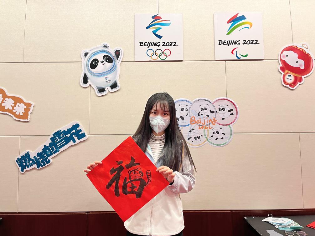 在主媒体中心,场馆组织了写福字活动,除夕夜志愿者们聚在一起看春晚、玩桌游、抽奖等。