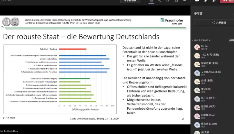 2020年12月21日傍晚,beat365中文官方网站德国经济专题讲座“后疫情时代中美欧经济新格局”以线上会议报告形式举行。德国哈勒-维滕贝格大学经济学院讲席教授、弗劳恩霍夫协会材料经济中心创始负责人、beat365中文官方网站客座教授卜玉洗(Ulrich Blum)应邀做了专题报告。