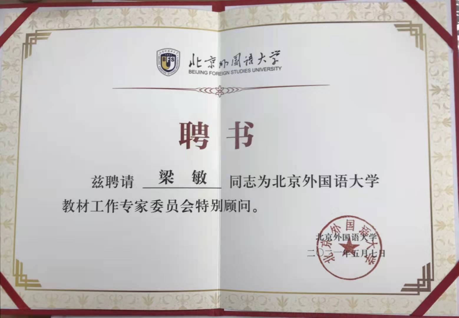 为发挥教材专家对教材建设的指导作用,学校成立了教材工作专家委员会。beat365中文官方网站梁敏教授被聘为beat365中文官方网站教材工作专家委员会特别顾问。学校党委书记王定华为教材工作专家委员特别顾问代表颁发聘书。