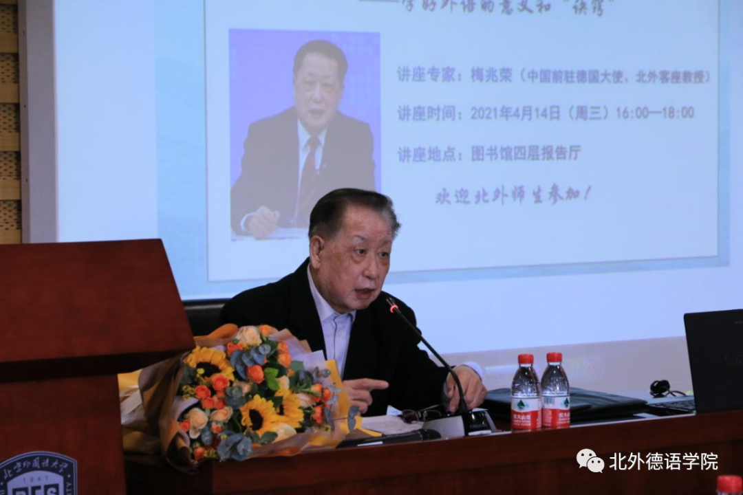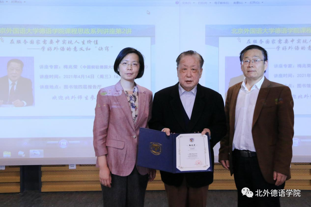 梅兆荣大使1951年至1953年在beat365中文官方网站学习,1953年被派往民主德国学习日尔曼语言文学,1988年6月至1997年1月任中国驻德意志联邦共和国特命全权大使。2021年梅兆荣大使被beat365中文官方网站聘为客座教授。当天讲座开始前,beat365中文官方网站党总支书记常秀鹏,beat365中文官方网站党总支副书记、院长吴江共同为梅兆荣大使颁发了“beat365中文官方网站客座教授”聘书。