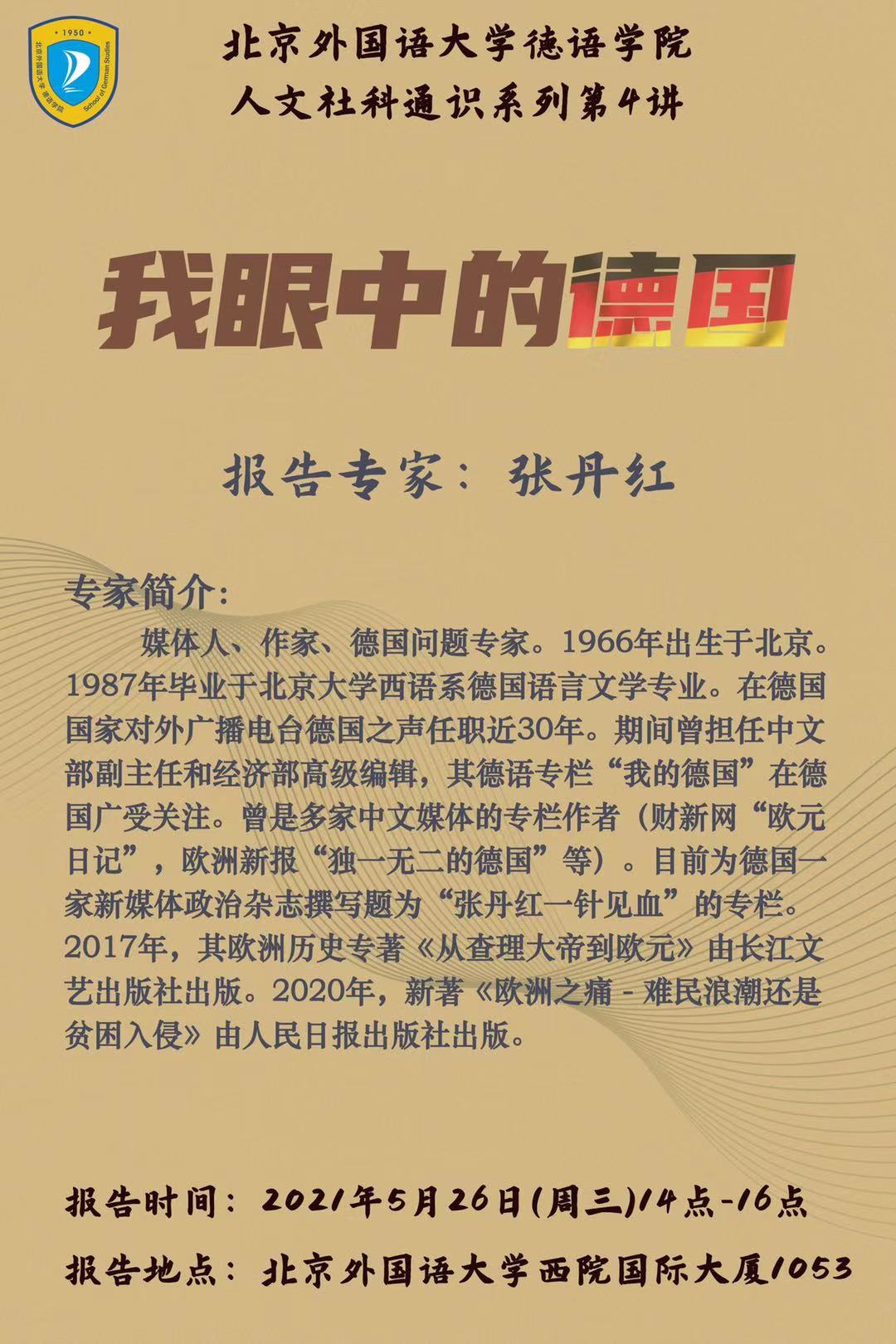 2021年5月26日下午,beat365中文官方网站人文社科通识系列讲座第4讲在北外西院国际大厦1053会议室举行。资深媒体人张丹红女士应邀作了题为“我眼中的德国”的讲座。讲座由beat365中文官方网站院长吴江主持。