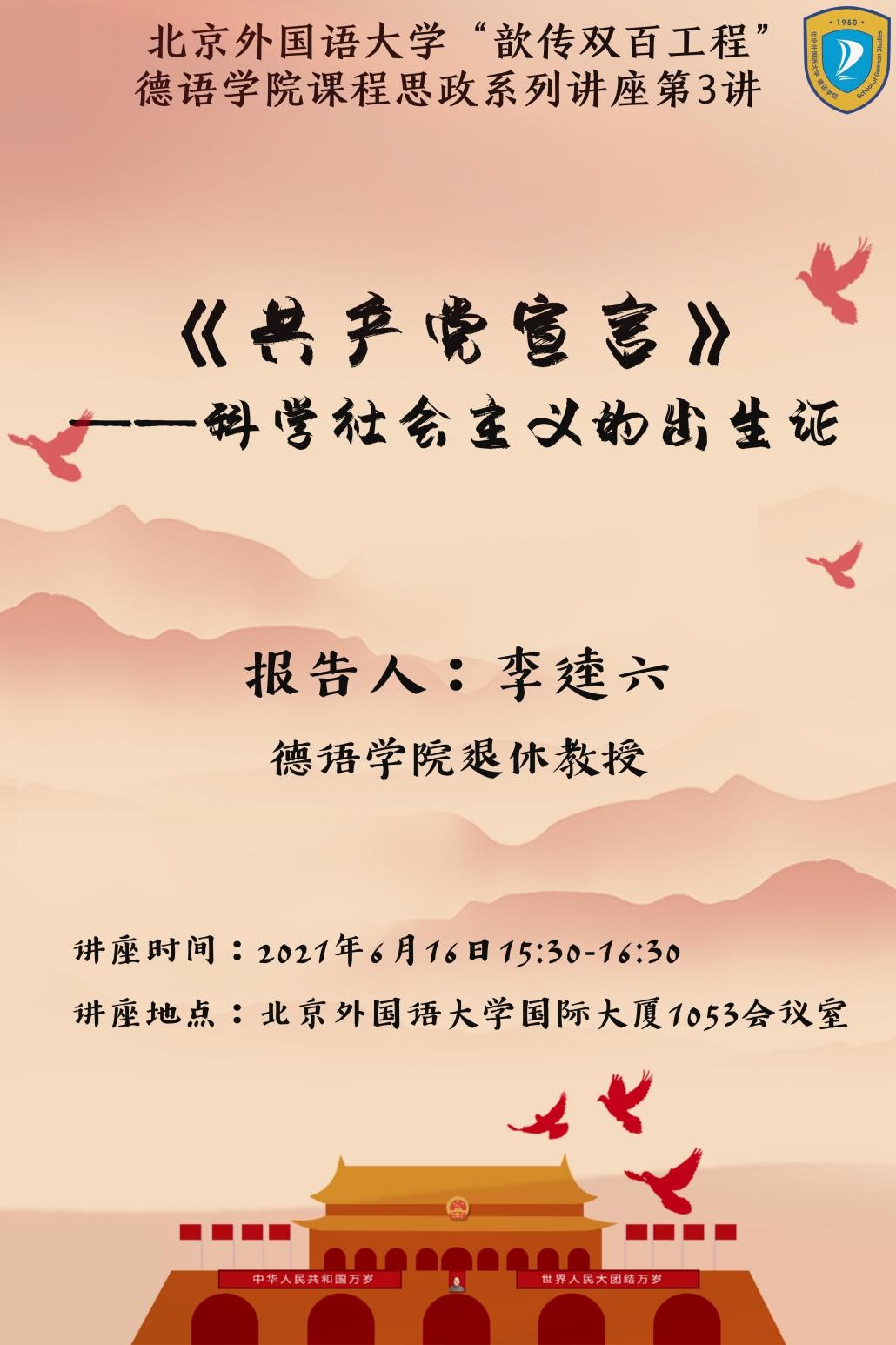 为迎接中国共产党百年华诞,深入学习党史,推进我校党委启动的“歆传双百工程”,beat365中文官方网站党总支和北外离退休党总支第十九党支部联合邀请到了beat365官网德高望重的退休教师李逵六教授举办了题为“《共产党宣言》:科学社会主义的出生证”的专题报告会。此次专题报告会也是beat365中文官方网站课程思政系列讲座之一。