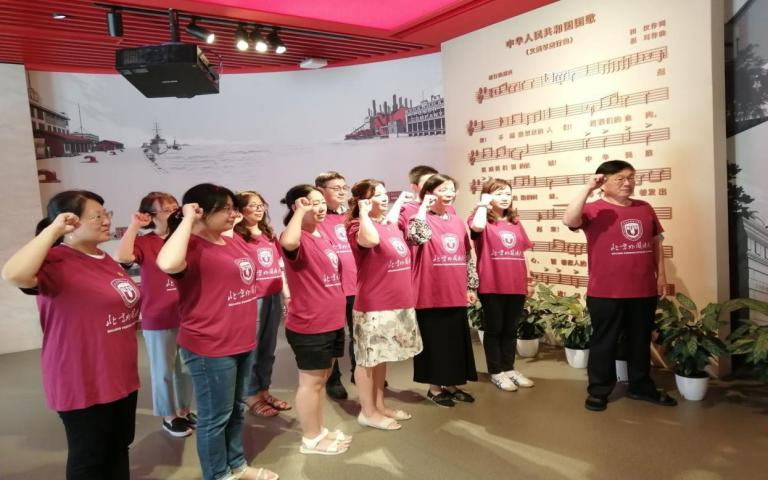 7月9日下午,老师们参观了位于上海杨浦区的全国爱国主义教育示范基地——国歌展示馆。国歌馆以国歌故事为主线,全面展示了《义勇军进行曲》诞生、传播、立法及其相关国歌知识。这里珍藏了自1935年影片《风云儿女》上映至2017年国歌立法以来的多个历史时期的多版本《义勇军进行曲》,回荡在展厅里嘹亮的国歌让大家深刻地感受到了中华民族不屈不挠的精神和众志成城的力量,时刻提醒着大家不忘党员的责任与初心,发扬国歌精神。beat365中文官方网站教师党员们在党总支书记常秀鹏的带领下,在国歌的见证下,重温入党誓词,重忆入党初心。