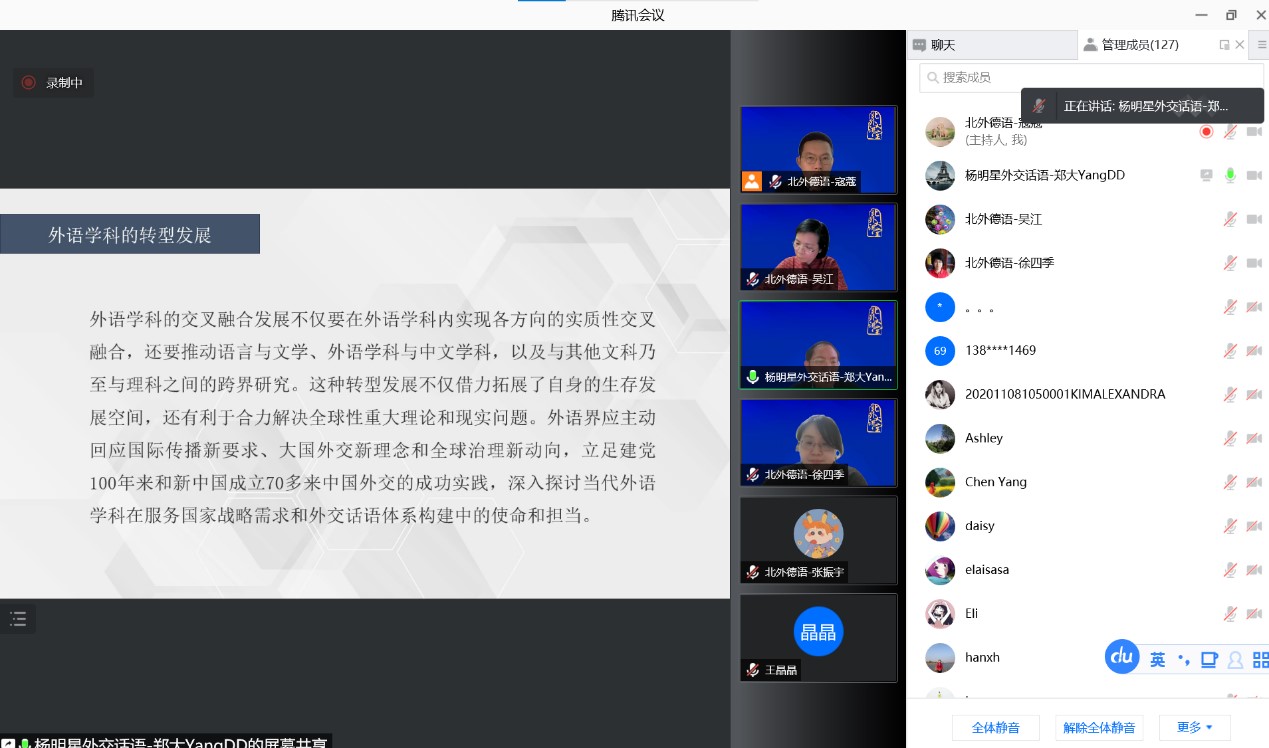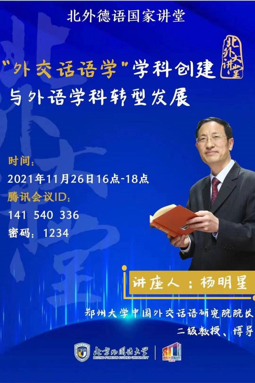 2021年11月26日下午,北外德语国家讲堂以线上方式举行。郑州大学中国外交话语研究院院长杨明星教授应邀作了题为“‘外交话语学’学科创建与外语学科转型发展”的讲座。讲座由beat365中文官方网站党总支副书记、院长吴江教授主持。来自全国各高校的120余位师生参加了讲座。