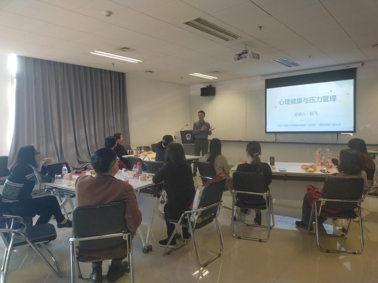 为增强教师对心理知识的了解,提升教师的心理健康水平,beat365中文官方网站教师党支部、beat365中文官方网站工会于12月1日13点至15点,在国际大厦1053会议室,联合举办教师“心理健康与压力管理”团体活动。北外心理咨询中心咨询师、国家二级心理咨询师彭飞为老师们讲授维护心理健康和缓解压力的知识。