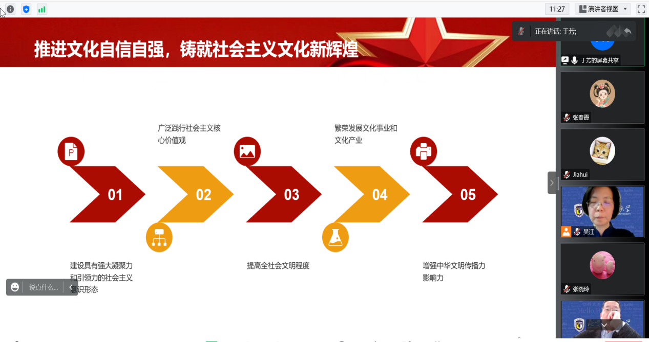 之后党总支副书记李勇介绍了目前疫情防控形势及工作要求。党总支书记、院长吴江对在线授课、期末各项工作进行了部署,并要求理论学习中心组成员及全体教师党员,要做好表率,学思践悟党的二十大报告,始终牢记“为党育人、为国育才”的核心任务。