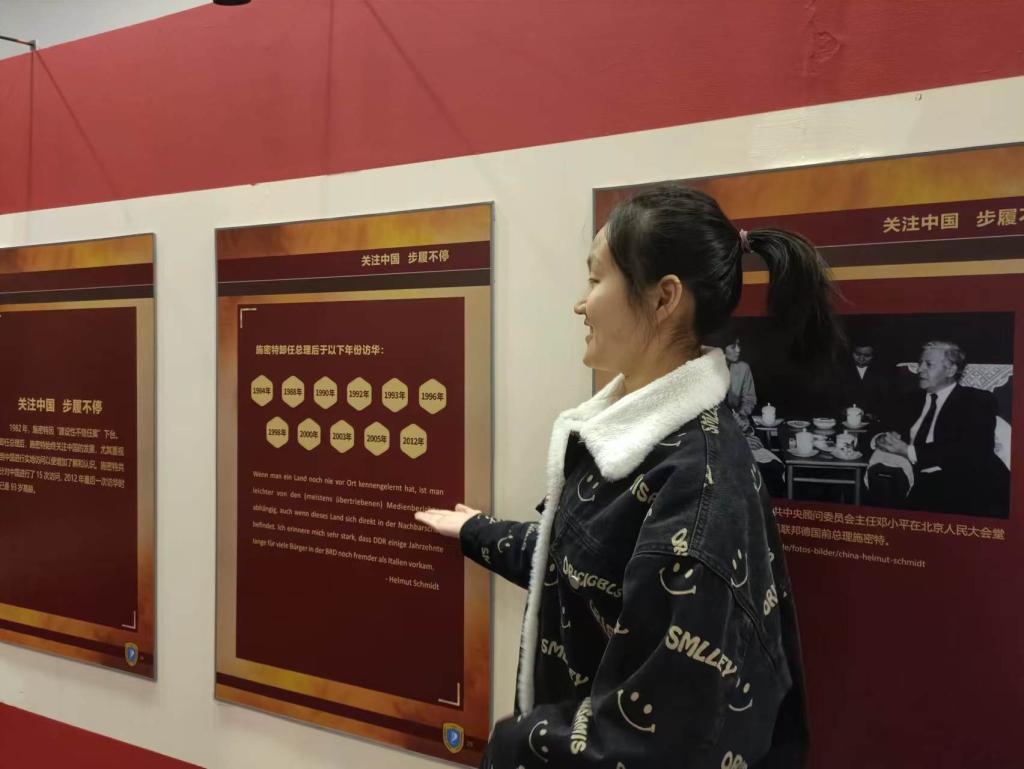 很荣幸能有此次机会担任中德展的讲解员,让我在加深自己对中德两国的了解的同时,把中德50年的友好关系讲给更多人听,同学长学姐们交流,向前辈们学习。在来访嘉宾的每一次驻足点头之间,我感觉自己口中的讲解词越来越有份量,也深深敬畏着中德友好关系的建设者、推动者,励志接好“桥梁建设者”这一棒,推动新时代中德关系行稳致远。