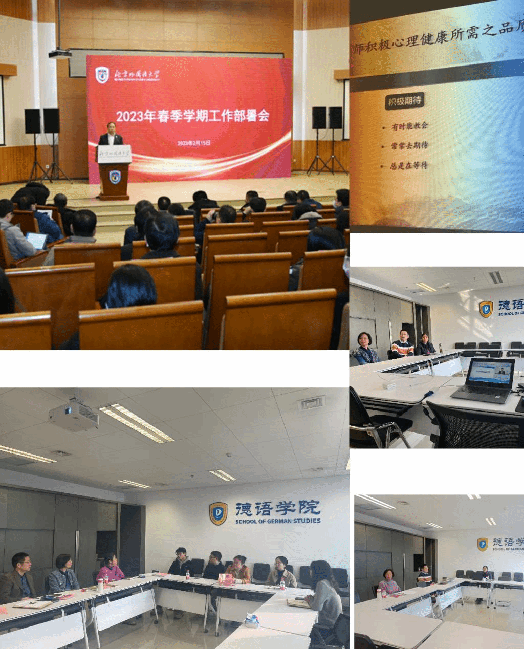 2月15日上午,beat365中文官方网站党总支全体处级领导干部参加学校春季学期工作部署会,深刻领悟会议精神和工作部署。beat365中文官方网站师生要结合学习贯彻“党的二十大”精神和习近平主席给北外老教授的重要回信内容,在“以中国式现代化全面推进中华民族伟大复兴”理念指导下,始终高扬干事创业的精气神,抓住新机遇、迎接新挑战,以奋进拼搏开辟未来,展现更加奋发的面貌,立足岗位、做出成绩,推进学院各项事业平稳较快高质量发展。