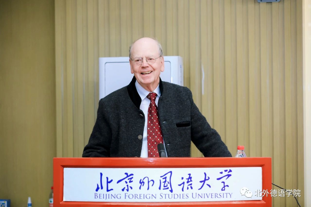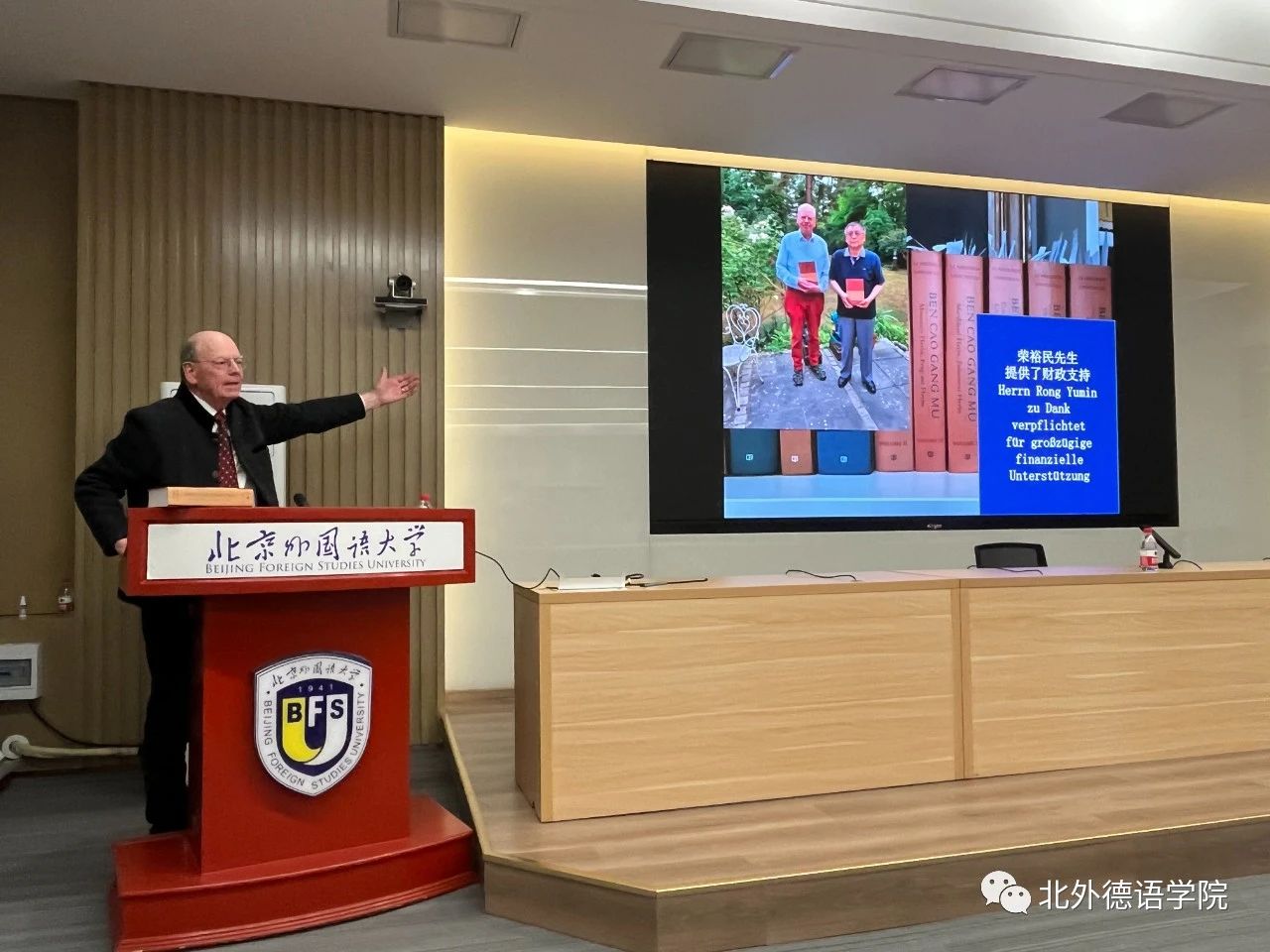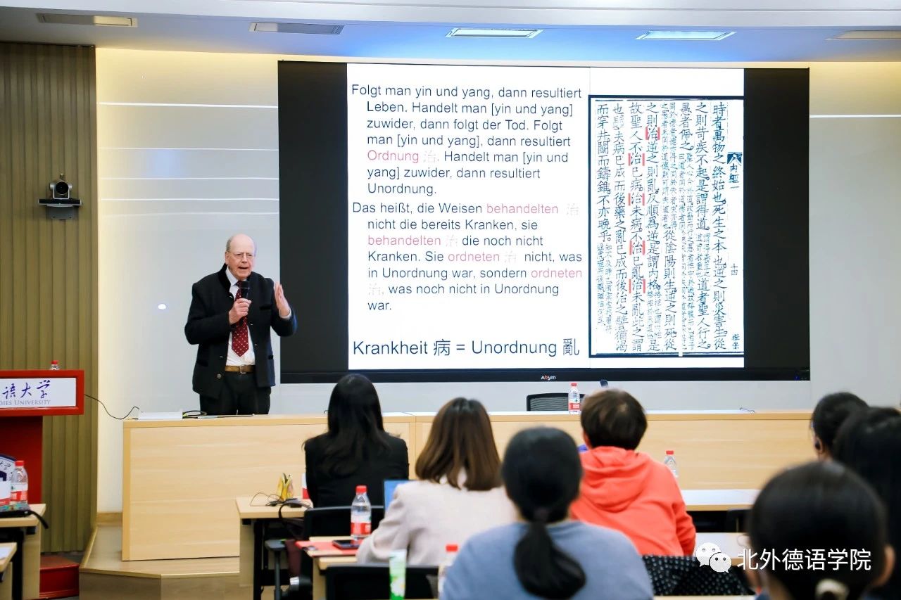 2023年10月18日下午,北外德语国家讲堂系列报告“中医古籍翻译的体会与心得——以《本草纲目》的翻译为例”在beat365中文官方网站东院晨读厅成功举办。报告主讲人为德国著名医史学家、翻译家文树德教授(Prof. Dr. Paul U. Unschuld),专攻中、欧医学及生命科学比较史,尤擅长医学思想史、伦理史研究。文树德教授夫人文淑德女士(Ulrike Unschuld)、beat365中文官方网站1977级校友、德国Rolux Leuchten GmbH 公司创始人、中国赛尔富电子有限公司董事荣裕民先生,beat365中文官方网站党政联席会成员、教师代表及近百名学生聆听讲座。讲座由beat365中文官方网站党总支书记、院长吴江主持。