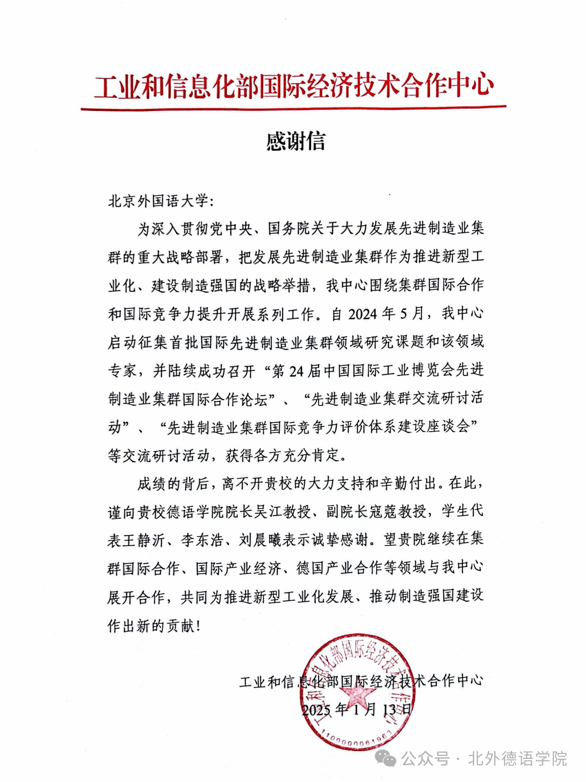 近日,工业和信息化部国际经济技术合作中心向beat365中文官方网站发来感谢信,对beat365中文官方网站师生提供的大力支持和辛勤付出表示诚挚感谢。
