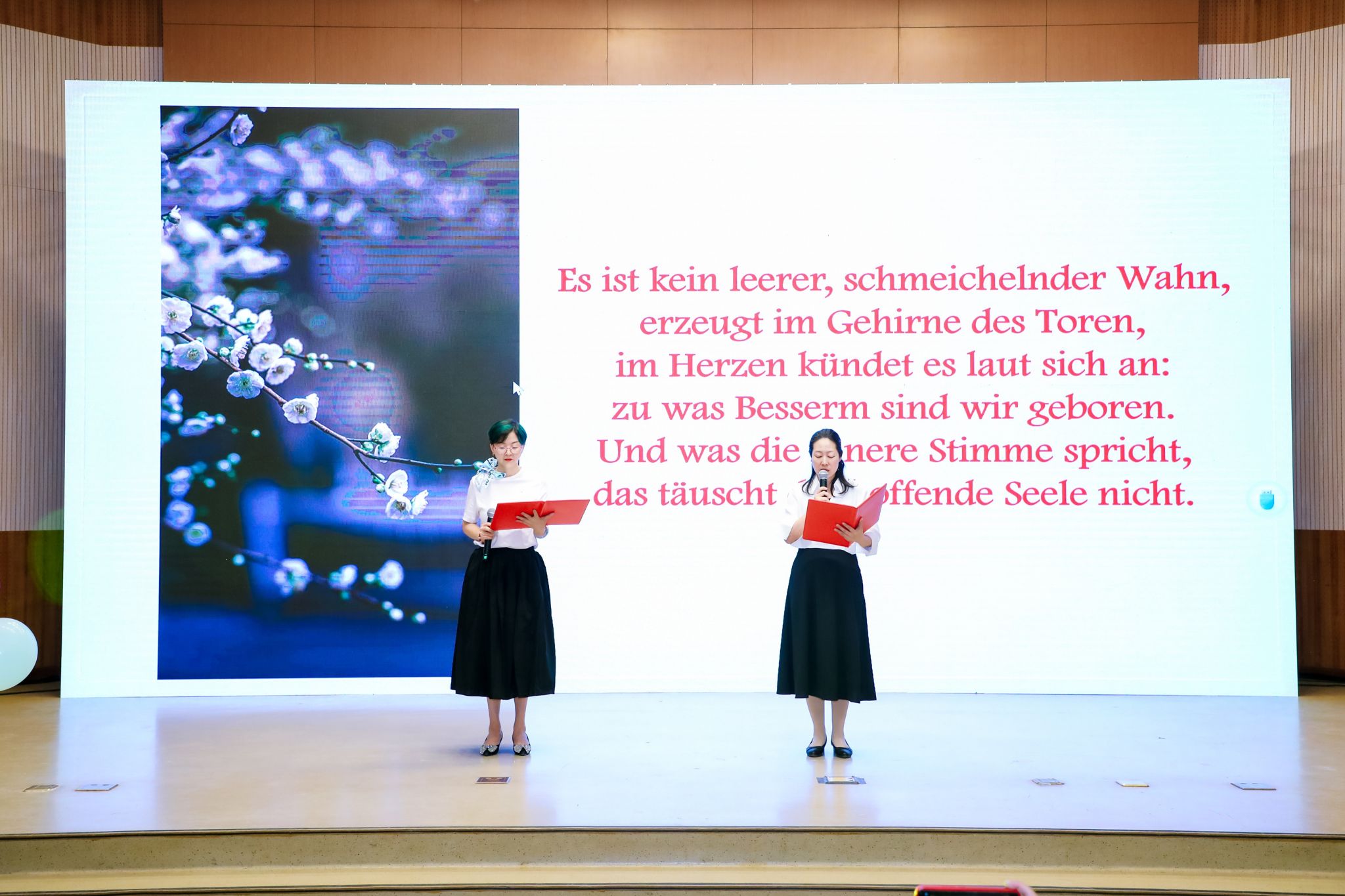 最后一幕“‘德’行致远”面向未来。舞台剧《未来已来,你在何处?》鼓励德语青年以坚定的步伐走向国际舞台。诗朗诵《万寿无疆》与啦啦操《家有德语》将师生情谊与青春风貌凝聚于舞台之上。两首德语童谣的温馨收尾,也唤醒了观众内心深处对童年的怀念与对初心的坚守。