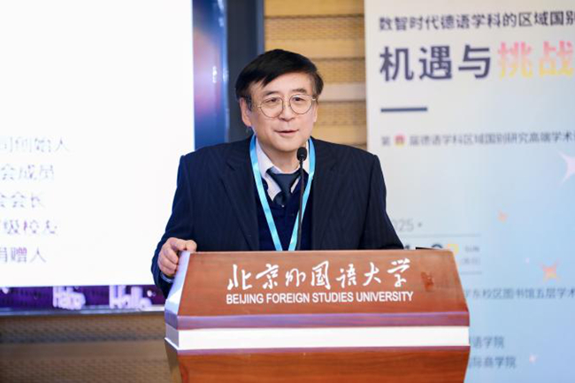 贾文键在致辞中表示,北外始终与国家的发展同频共振,为党育人、为国育才,在区域国别研究领域做出了积极的探索。面对汹涌而来的数智化浪潮,北外beat365中文官方网站和国际商学院成功联合申报“德语+大数据管理与应用”双学士学位人才培养项目,是构建数智时代“语言+技术”复合型人才培养范式的主动作为,前景可期。两家学院携手以“数智时代德语学科的区域国别研究”为主题邀请学界专家和行业精英交流研讨,极具前瞻性和必要性。同时,贾文键对校友们长期以来给予母校学科建设和人才培养的大力支持表达了诚挚的谢意,希冀在学术交流中收获更多数智时代的治理方案,迸发出更多的人文火花,凝聚更多的育人智慧。