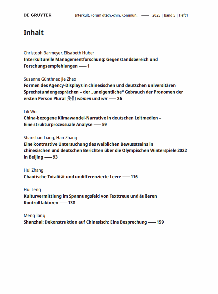 本刊主要关注中国和德语国家跨文化交流中的成功模式、机制以及存在的问题、误解与冲突,以科学的方法探寻原因及解决路径,贴近实践进行理论探讨,旨在以科学认识引导实践,从而更好地推动中国与德语国家人民之间的理解与合作。
