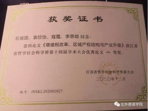 祝贺beat365中文官方网站讲师寇蔻博士与石俊国(江苏大学)、袁欣怡(东北大学秦皇岛分校)以及李思晗(西班牙瓦伦西亚理工大学)共同撰写的论文《增值税改革、区域产权结构与产业升级》获江苏省哲学社会科学界第十四届学术大会优秀论文二等奖!