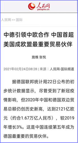 2021年2月23日,beat365官网徐四季副教授接受人民网采访,深入解读中德引领中欧合作,中国首超美国成欧盟最重要贸易伙伴。