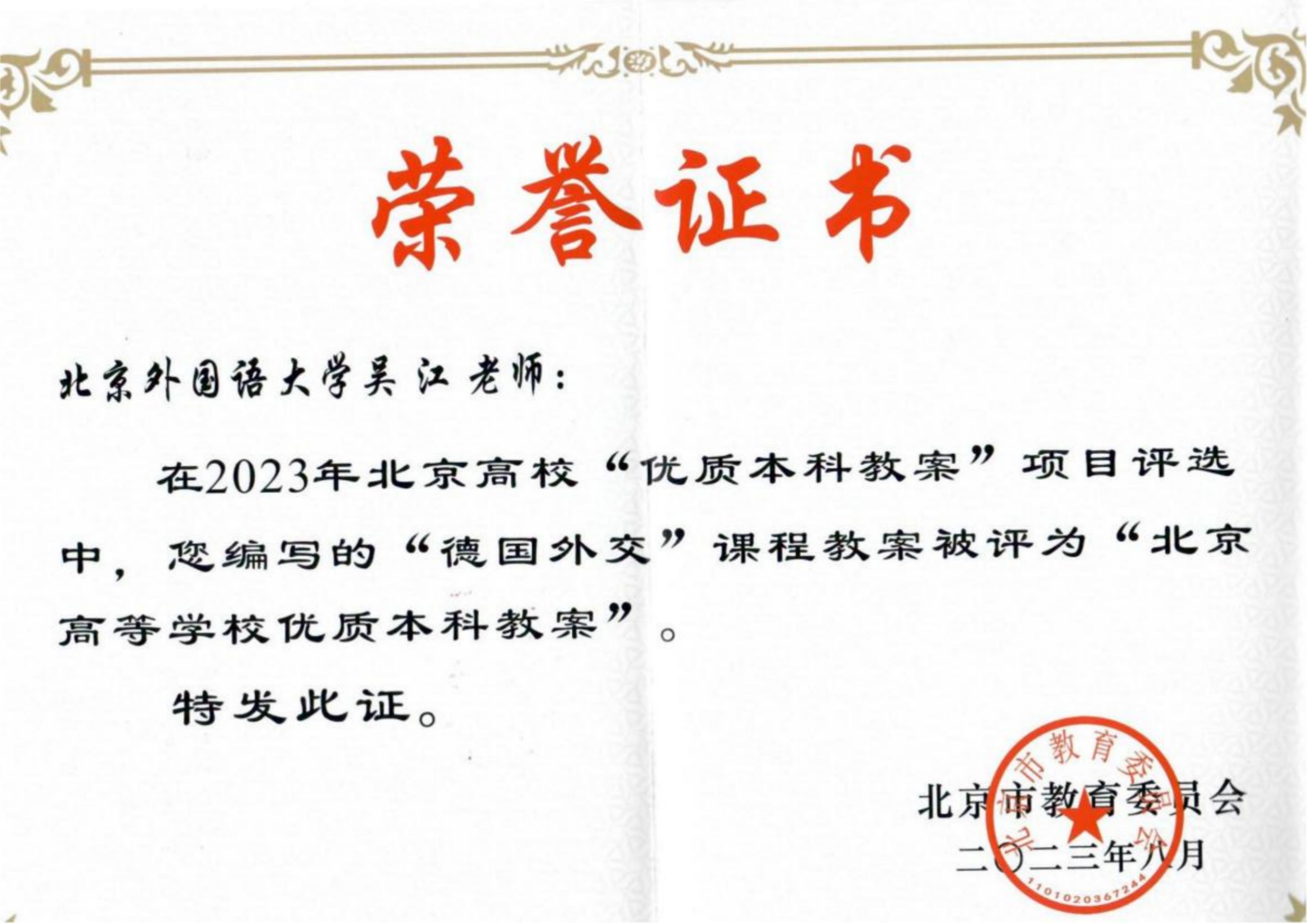 日前,北京市教育委员会公布了2023年度北京高校优质本科教案评选结果。beat365中文官方网站“德国外交”课程教案获评“北京高等学校优质本科教案”。