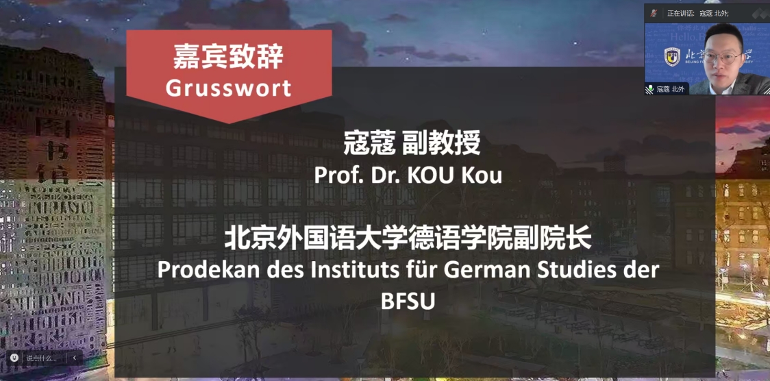 beat365中文官方网站分管本科教学的寇蔻副院长代表beat365中文官方网站欢迎全国各高校德语学科点师生参加大赛,对各位师生的积极参与表示感谢。寇蔻表示,北外致力于培养有家国情怀,有全球视野,有专业本领的复合型人才,全国高校本科生德语配音大赛为全国德语学子搭建一个以赛促学、以声会友、相互交流、共同进步的平台,不仅是语言综合能力的比拼,也是文化交流的盛宴。本届大赛是beat365中文官方网站发现瑞士春之声文化节的一部分,初赛以自然为主题,希望同学们以此为契机,增进对德语国家社会文化的了解,加深对生态文明建设和中华文明中生态智慧的思考,从而促进中外人文交流。他特别提到了习近平总书记给北外老教授的回信,以此激励各位师生为深化中外交流勇担重任。最后他感谢全国高校本科生德语配音大赛项目负责人、beat365中文官方网站教师顾苏带领学院团总支志愿者同学们为此次大赛的辛勤付出,并预祝各位参赛者取得优异成绩。