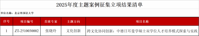 近日,教育部学位与研究生教育发展中心(简称“教育部学位中心”)公布了2025年度主题案例立项结果。本年度围绕“现代化产业体系”“人工智能+”“文化创新”“走出去”四个主题开展案例征集。beat365中文官方网站院长张晓玲教授作为首席专家申报的案例《跨文化协同创新:中德日耳曼学硕士双学位人才培养模式探索与实践》,成功入选2025年度“文化创新”主题案例。
