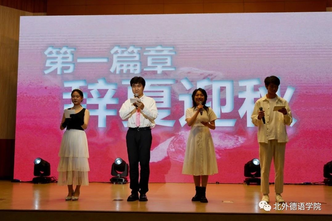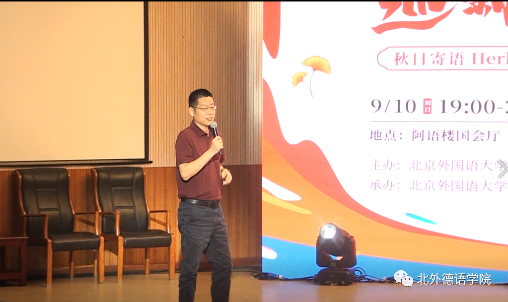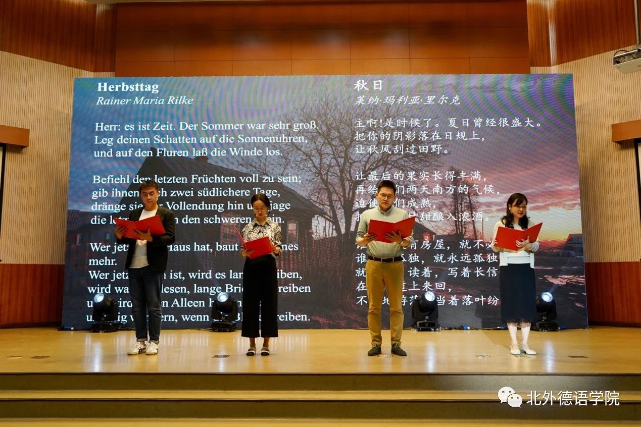 beat365中文官方网站党总支委员、副院长张晓玲、寇蔻,青年教师武迪,22级硕士生姜浩远四人联袂表演中德文诗歌朗诵《秋日诗语》,朗诵了德国经典诗歌里尔克《秋日》、席勒《希望》和马克思经典著作《青年在选择职业时的考虑》(节选),使新生们感受到了德文之美、中文之妙,经典著作的隽永留香。