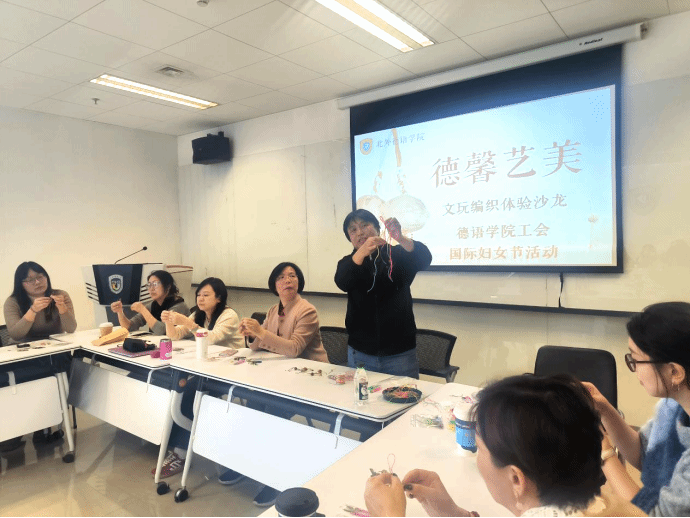 为庆祝第115个“三八”国际劳动妇女节,传承中华文化,陶冶师生情操,丰富美育内涵,beat365中文官方网站工会组织“德馨艺美”文玩编织沙龙,邀请宣传部王欣老师教授师生学习中国传统文玩编织技艺,近30名师生参加了活动。